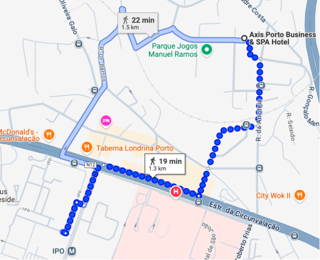 The accommodation will take place in the Axis Porto Hotel, Portugal (left image). Axis Hotel is located 19 minutes walking distance from IPO PORTO (right image).